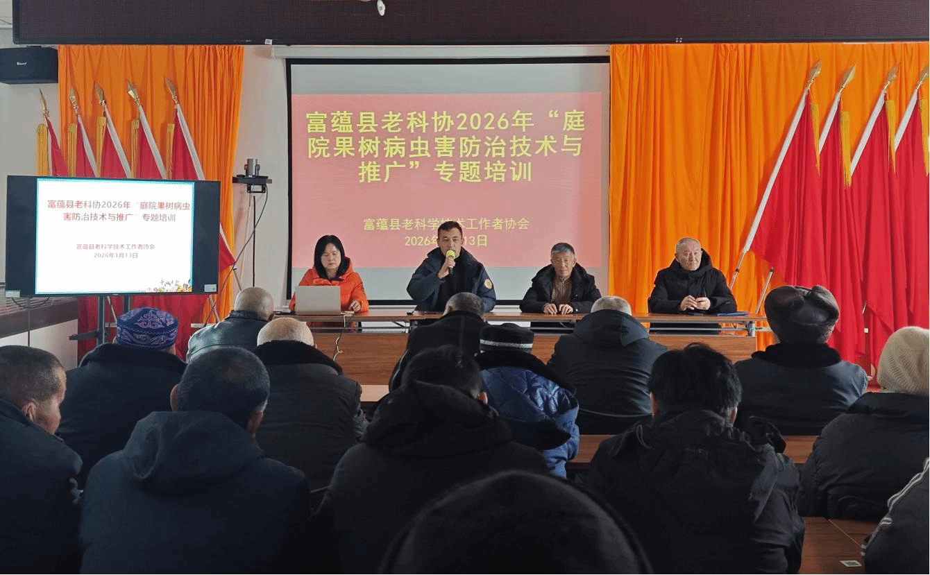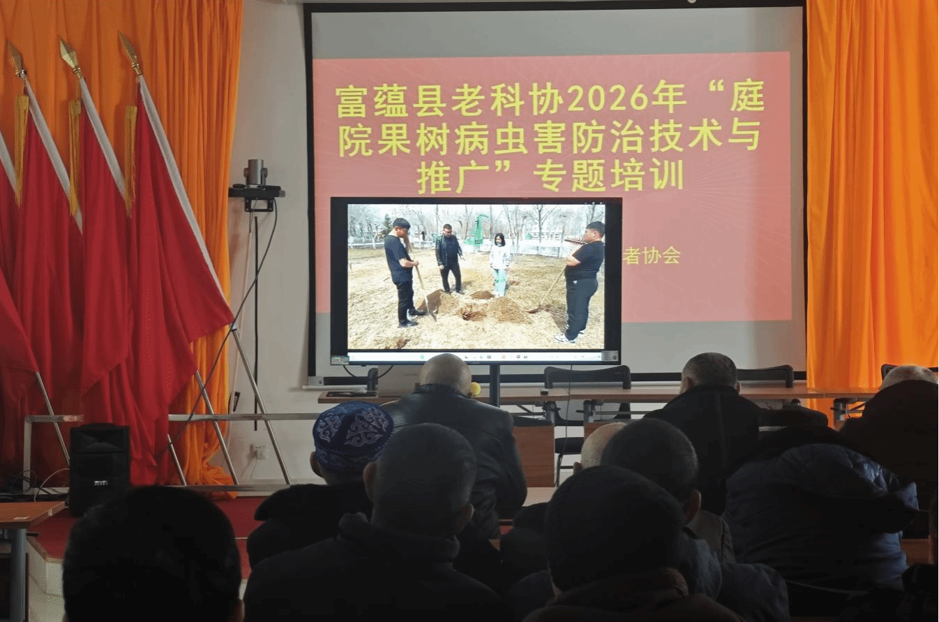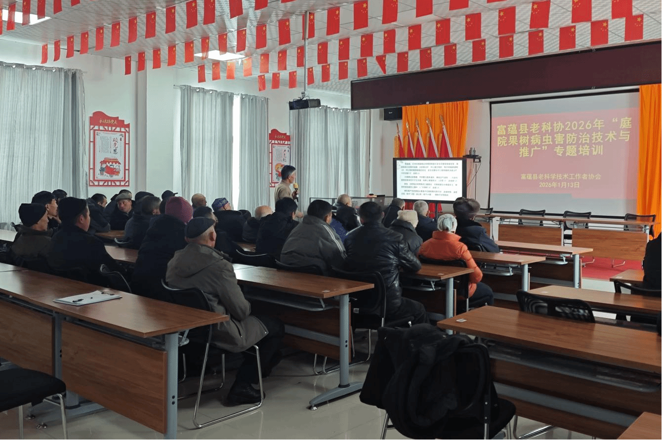 2026年1月13日,富蕴县老科协专家团队走进克孜勒希力克乡萨尔托海村,以多媒体授课的模式,开展庭院果树高产栽培、病虫害防治及牛羊养殖技术专题培训,为该村去年新植的3000余株庭院果树提质增效和畜禽养殖升级注入科技动能,助力农牧民让“方寸庭院”变身“增收宝地”。