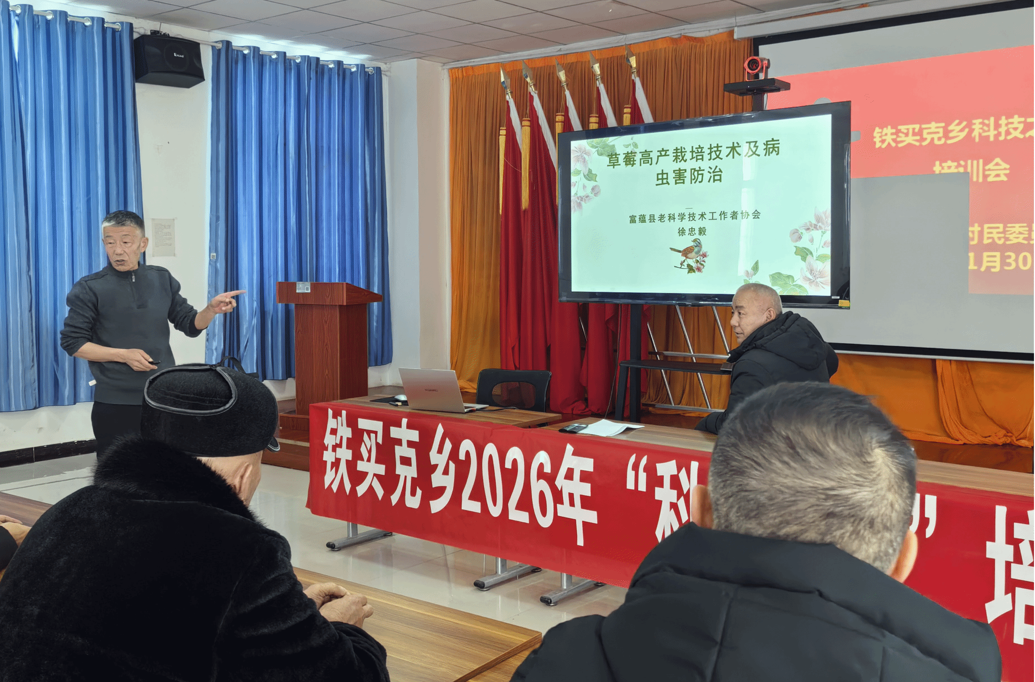 2026年1月30日,富蕴县老科协专家团队深入铁买克乡铁买克村,开展黑加仑、草莓等小浆果高产栽培及病虫害防治专项技术培训,以精准科技服务破解农牧民种植技术难题,助力特色产业提质增效,激活庭院经济发展新动能,切实推动乡村振兴落地见效。