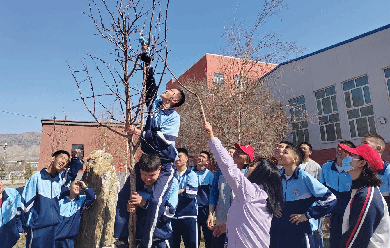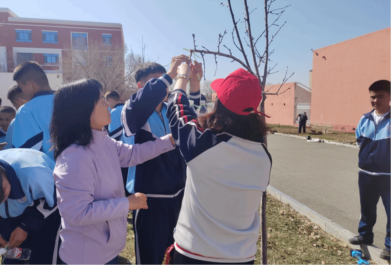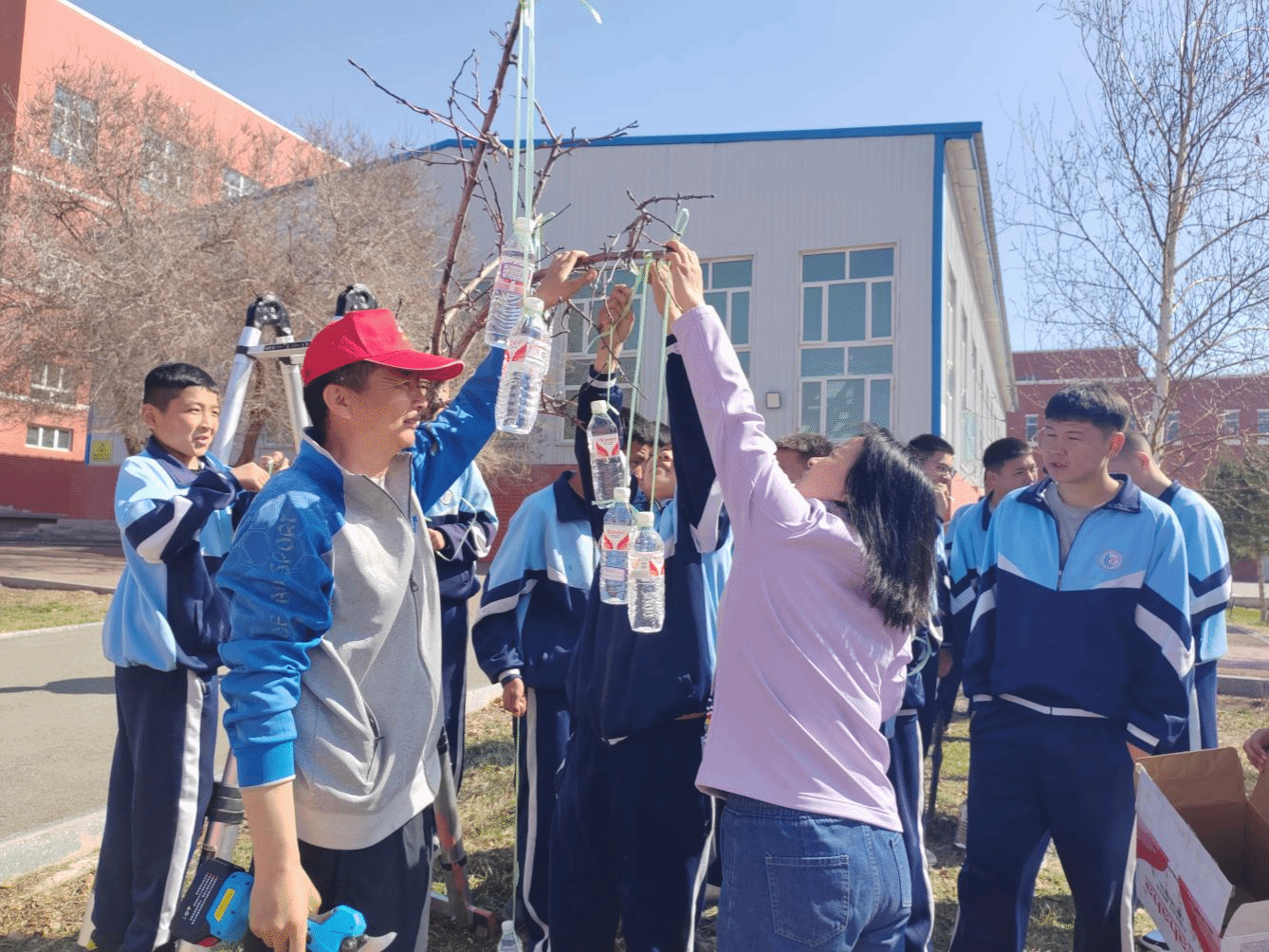 师生们认真聆听、踊跃提问,现地课堂氛围热烈有序,大家对果树生长规律与管护要点有了系统认知。理论讲解结束后,专家带领学生手把手指导修剪手法,同学们亲自动手操作,在实践中巩固所学知识。每人带一瓶水写下心愿,以吊果枝的形式,挂在树尖助力果树增产增收。同时,专家团队对学校后勤管理教师开展树体管护、病虫害综合防治专项培训,助力校园绿化提质增效。