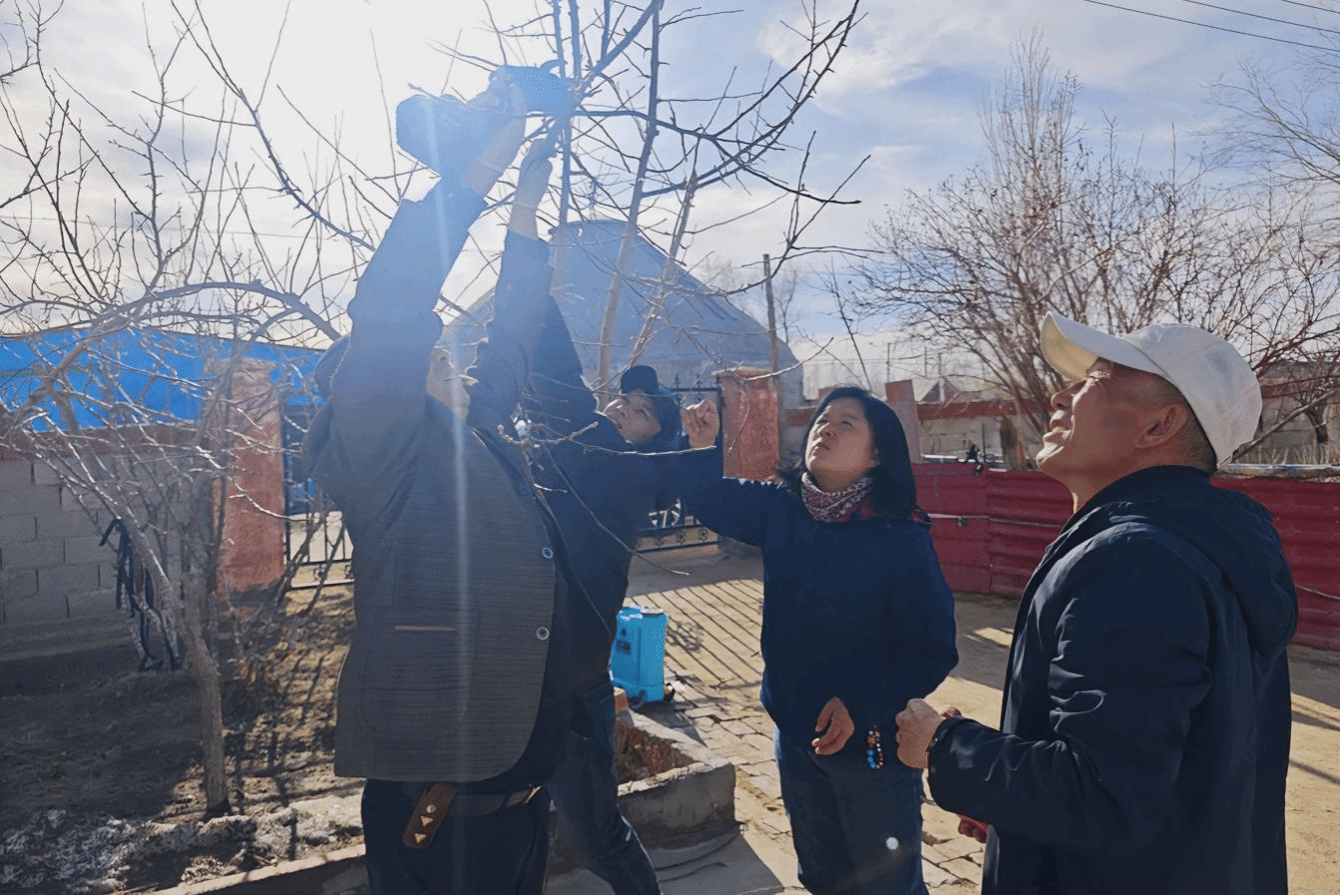 自该村启动村庄绿化项目以来,富蕴县老科协技术团队持续跟进、全程跟踪指导,把技术服务贯穿庭院种植全周期。此次现场指导中,专家们用一整天时间深入农户庭院,手把手带领农牧民开展果树整形修剪,现场示范石硫合剂配制比例、搅拌方法与规范喷洒要点,确保每一户都能掌握实操技巧。